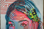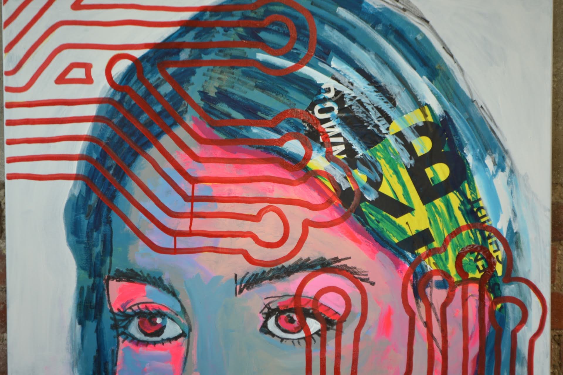 The mixed-media technique—combining collage, spray paint, and acrylic—creates dynamic textures and layers that reflect the complexity of this collective network. Chips and circuits emerge from the figures, flowing from their heads or merging with their bodies, symbolizing how deeply technology has become embedded in our identities. These elements are not foreign but extensions of us, representing both the beauty and the chaos of living in a hyperconnected age.