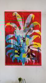 Using a mixed-media technique of collage, spray paint, and acrylic, I sought to reimagine the relationship between presence and absence. The vibrant textures and bold colors fill the space around the plants, creating a contrast that invites the viewer to focus on what is not painted: the shape of the plant itself. This negative space becomes the protagonist, proving that even in silence, nature speaks volumes.