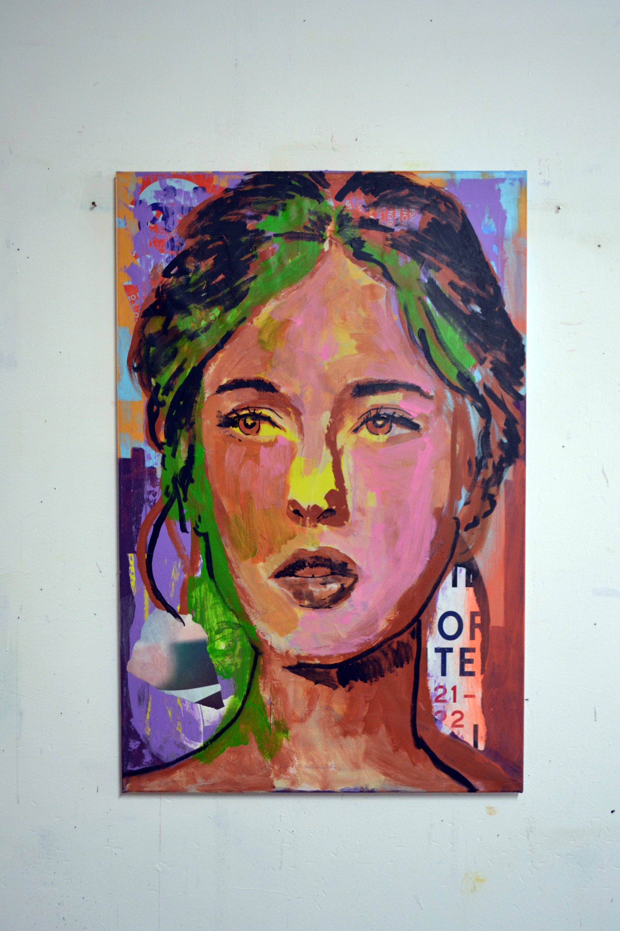 Technique: Mixed media (collage, spray paint, and acrylic)
